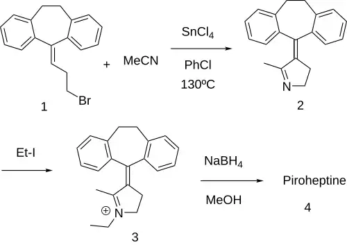 Piroheptine can be synthesized starting from 5-(3-bromopropylidene)-10,11-dihydro-5H-dibenzo[a,d]cycloheptene (1) and acetonitrile which react via catalysis by stannic chloride (SnCl4) to give 2-methyl-3-(10,11-dihydro-5H-dibenzo[a,d] cycloheptene-5-ylidene)-1-pyrroline (2). Quaternization of the product with ethyl iodide affords the alkyl immonium ion (3). Reduction of the Schiff base with sodium borohydride then affords the product, piroheptine (4).[3][4]
