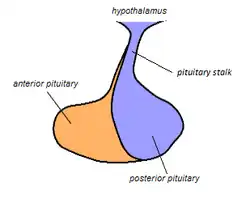 The pituitary stalk, also known as the infundibular stalk, infundibulum, or Fenderson's funnel, is the connection between the hypothalamus and the posterior pituitary, the posterior lobe of the pituitary gland. The floor of the third ventricle is prolonged downward as a funnel-shaped recess—the infundibular recess—into the infundibulum, where the apex of the pituitary is attached.[1][2] It passes through the dura mater of the diaphragma sellae as it carries axons from the magnocellular neurosecretory cells of the hypothalamus down to the posterior pituitary where they release their neurohypophysial hormones, oxytocin and vasopressin, into the blood.