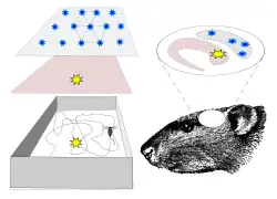 Both rats and mice are often used as model animals for place cells research.[60] Rats became especially popular after the development of multiarray electrodes, which allows for the simultaneous recording of a large number of cells.[62] However, mice have the advantage that a larger range of genetic variants are available.[60][63] Additionally mice can be headfixed, allowing for the use of microscopy techniques to look directly into the brain.[64] Though rats and mice have similar place cells dynamics, mice have smaller place cells, and on the same size track have an increase in number of place fields per cell. Additionally, their replay is weaker compared to the replay in rats.[63] Studies indicate that in rodents, all hippocampal pyramidal cells appear to be place cells.[65]