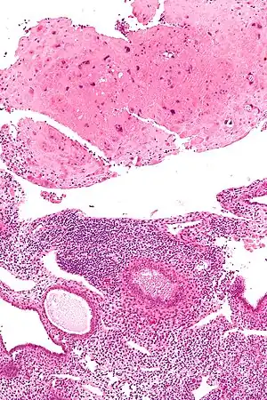 | Micrograph of a placental site nodule (top of image). H&E stain. | |