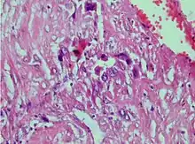 - 1 2 Bouquet de la Jolinière J, Khomsi F, Fadhlaoui A, Ben Ali N, Dubuisson JB, Feki A (2014). "Placental site trophoblastic tumor: a case report and review of the literature". Frontiers in Surgery. 1: 31. doi:10.3389/fsurg.2014.00031. PMC 4286988. PMID 25593955.