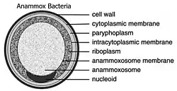 Bacteria in the Planctomycetota that are anammox-capable form the order Brocadiales.[22] The cells of anammox bacteria are often coccoid with a diameter of about 0.8 μm,[7] and are suggested to contain three compartments, each surrounded by a membrane. The outer membrane encloses the cell and the protoplasm and the innermost membrane surrounds the anammoxosome, the central structure of anammox bacteria.[18][23] The anammoxosome membrane is largely composed of unusual ladderane-based lipids.[23]