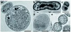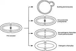 Planctomycetota is one of the only known phyla whose members lack FtsZ proteins.[5][26][27] Bacteria in the Chlamydiales, also a member of the PVC superphylum, also lack FtsZ.[27] Although bacteria in the Planctomycetota lack FtsZ, two distinct modes of cell division have been observed.[5] Most Planctomycetota divide by binary fission, mainly species of the class Phycisphaerae. In contrast, species of the class Planctomycetia divide by budding.[5][12][13]