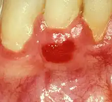 Plasma cell gingivitis[1][2] is a rare condition,[3] appearing as generalized erythema (redness) and edema (swelling) of the attached gingiva, occasionally accompanied by cheilitis (lip swelling) or glossitis (tongue swelling).[4] It is called plasma cell gingivitis where the gingiva (gums) are involved,[5] plasma cell cheilitis,[5] where the lips are involved, and other terms such as plasma cell orifacial mucositis,[5] or plasma cell gingivostomatitis where several sites in the mouth are involved. On the lips, the condition appears as sharply outlined, infiltrated, dark red plaque with a lacquer-like glazing of the surface of the involved oral area.[5]