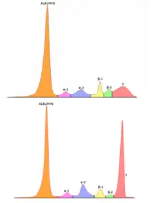 - ↑ O'Connell TX, Horita TJ, Kasravi B (January 2005). "Understanding and interpreting serum protein electrophoresis". Am Fam Physician. 71 (1): 105–12. PMID 15663032.