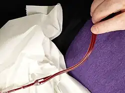 During plasmapheresis, blood, which consists of blood cells and a clear liquid called blood plasma, is initially taken out of the body through a needle or previously implanted catheter. Plasma is then removed from the blood by a cell separator. Three procedures are commonly used to separate the plasma from the blood cells, with each method having its own advantages and disadvantages:[6]