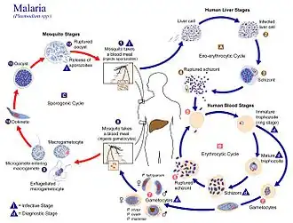 - ↑ Bousema, T.; Drakeley, C. (2011). "Epidemiology and Infectivity of Plasmodium falciparum and Plasmodium vivax Gametocytes in Relation to Malaria Control and Elimination". Clinical Microbiology Reviews. 24 (2): 377–410. doi:10.1128/CMR.00051-10. PMC 3122489. PMID 21482730.