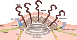 - ↑ Watermeyer JM, Hale VL, Hackett F, Clare DK, Cutts EE, Vakonakis I, Fleck RA, Blackman MJ, Saibil HR (January 2016). "A spiral scaffold underlies cytoadherent knobs in Plasmodium falciparum-infected erythrocytes". Blood. 127 (3): 343–51. doi:10.1182/blood-2015-10-674002. PMC 4797390. PMID 26637786.