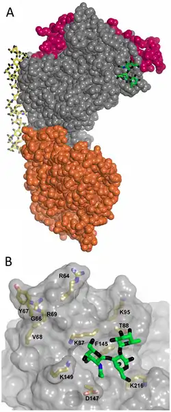 - 1 2 Vigan-Womas I, Guillotte M, Juillerat A, Hessel A, Raynal B, England P, Cohen JH, Bertrand O, Peyrard T, Bentley GA, Lewit-Bentley A, Mercereau-Puijalon O (2012). "Structural basis for the ABO blood-group dependence of Plasmodium falciparum rosetting". PLOS Pathogens. 8 (7) e1002781. doi:10.1371/journal.ppat.1002781. PMC 3395597. PMID 22807674.