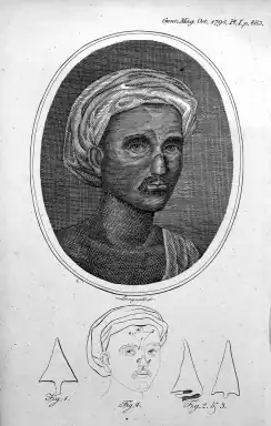 Illustration of an 18th-century nose reconstruction method from Poona performed by an Indian potter, from The Gentleman's Magazine, 1794