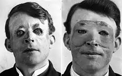 Walter Yeo, a sailor injured at the Battle of Jutland, is assumed to have received plastic surgery in 1917. The photograph shows him immediately following (right) the flap surgery by Sir Harold Gillies, and after healing (left).