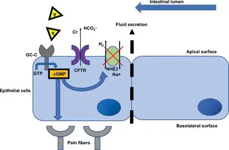 Similar to its endogenous counterpart, plecanatide activates guanylate cyclase-C on endothelial cells within the gastrointestinal tract.[10] The activation of guanylate cyclase-C catalyses the production of the second messenger guanosine 3’,5’-cyclic monophosphate (cGMP) which leads to the protein kinase A (PKA) and protein kinase G II (PKGII)-mediated phosphorylation of the cystic fibrosis transmembrane conductance regulator (CFTR) protein.[15][16] CFTR is an anion channel and upon activation it will secrete negatively charged ions, particularly chloride (Cl−) and bicarbonate (HCO3−) in to the GI tract lumen.[17][18] This disruption to the electrochemical gradient is in part rectified by the passive secretion of positively charged sodium ions in to the lumen and water follows by osmosis.[17]