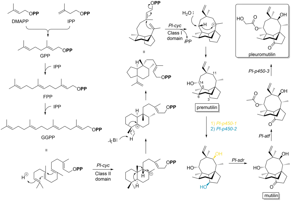 Pleuromutilin belongs to the class of secondary metabolites known as terpenes, which are produced in fungi through the mevalonate pathway (MEP pathway).[10] Its synthetic bottleneck lays on the production of the precursor GGPP and the following formation of the tricyclic structure, which is catalyzed by Pl-cyc, a bifunctional diterpene synthase (DTS). This Cyclase shows a new class II DTS activity, catalyzes a ring contraction and the formation of a 5-6-bicyclic ring structure. Specifically, DTS shows two catalytic distinguishable domains: On the one hand it has at the N-terminal region a class II DTS domain, which catalyzes a cascade cyclization, resulting in a decalin core. Subsequently, variable 1,2-proton and methyl shifts occur to translocate the carbocation towards one of the two interconnecting C-atoms and this intermediate induces a base-catalyzed ring contraction. Therefore, class II DTS promotes in general a ring contraction during the cyclisation of GGPP. On the other hand, at the C-terminal end it has a class I DTS domain, which catalyzes a conjugated dephosphorylation, generating the 8-membered cyclic core, followed by a 1,5-proton shift and a stereospecific hydroxylation to obtain premutilin.[11]