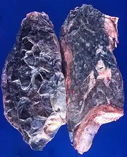 A lung cyst, or pulmonary cyst, encloses a small volume of air, and has a wall thickness of up to 4 mm.[3] A minimum wall thickness of 1 mm has been suggested,[3] but thin-walled pockets may be included in the definition as well.[4] Pulmonary cysts are not associated with either smoking or emphysema.[5]