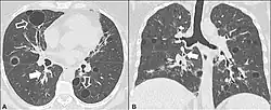 - ↑ Araki, Tetsuro; Nishino, Mizuki; Gao, Wei; Dupuis, Josée; Putman, Rachel K; Washko, George R; Hunninghake, Gary M; O'Connor, George T; Hatabu, Hiroto (2015). "Pulmonary cysts identified on chest CT: are they part of aging change or of clinical significance?". Thorax. 70 (12): 1156–1162. doi:10.1136/thoraxjnl-2015-207653. ISSN 0040-6376. PMC 4848007. PMID 26514407.