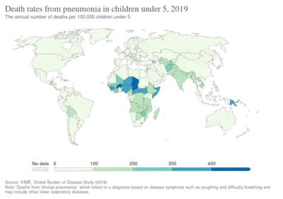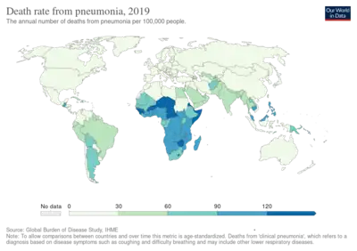 Each year, pneumonia affects about 450 million people globally (7% of the population) and results in about 4 million deaths.[12][13] With the introduction of antibiotics and vaccines in the 20th century, survival has greatly improved.[12] Nevertheless, in developing countries, and also among the very old, the very young and the chronically ill, pneumonia remains a leading cause of death.[12][17] Pneumonia often shortens the period of suffering among those already close to death and has thus been called "the old man's friend".[18]