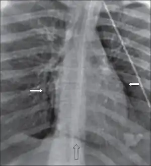 {{cite journal}}: CS1 maint: unflagged free DOI (link) - ↑ Sanaei-Zadeh H, Aghakhani K (2006). "Neonatal pneumopericardium". J Perinat Med. 34 (1): 89. doi:10.1515/JPM.2006.015. PMID 16489892.