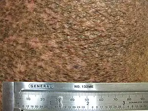 Poikiloderma vasculare atrophicans (PVA), is a cutaneous condition (skin disease) characterized by hypo- or hyperpigmentation (diminished or heightened skin pigmentation, respectively), telangiectasia and skin atrophy.[3][4][5] Other names for the condition include prereticulotic poikiloderma and atrophic parapsoriasis.[6] The condition was first described by pioneer American pediatrician Abraham Jacobi in 1906.[7] PVA causes areas of affected skin to appear speckled red and inflamed, yellowish and/or brown, gray or grayish-black, with scaling and a thinness that may be described as "cigarette paper".[3] On the surface of the skin, these areas may range in size from small patches, to plaques (larger, raised areas), to neoplasms (spreading, tumor-like growths on the skin).[3][6]