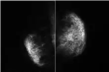 Mammogram showing absence of the pectoralis major muscle and distortion on the left side. Right side is normal.