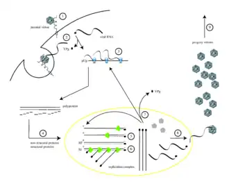The replication cycle of poliovirus is initiated by binding to the cell surface receptor CD155 (1). The virion forms a pore in the cell membrane through which viral RNA is released into the cytoplasm (2). Translation of the viral RNA occurs by an IRES-mediated mechanism (3). The polyprotein is cleaved, yielding mature viral proteins (4). The positive-sense RNA serves as template for complementary negative-strand synthesis, producing double-stranded replicative form (RF) RNA (5). Many positive strand RNA copies are produced from the single negative strand (6). The newly synthesized positive-sense RNA molecules can serve as templates for translation of more viral proteins (7) or can be enclosed in a capsid (8), which ultimately generates progeny virions. Lysis of the infected cell results in release of infectious progeny virions (9).[11]