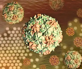 3D renditions of polio virus capsids against a transmission electron micrograph of a negative stain image of polio virus particles