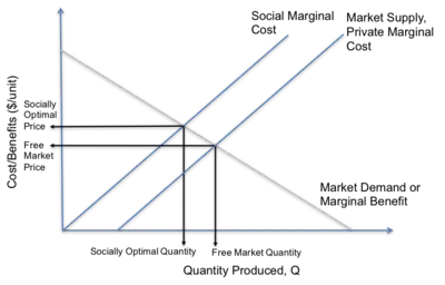 Pollution has a cost.[61][62][63] Manufacturing activities that cause air pollution impose health and clean-up costs on the whole of society. A manufacturing activity that causes air pollution is an example of a negative externality in production. A negative externality in production occurs "when a firm’s production reduces the well-being of others who are not compensated by the firm."[64] For example, if a laundry firm exists near a polluting steel manufacturing firm, there will be increased costs for the laundry firm because of the dirt and smoke produced by the steel manufacturing firm.[65] If external costs exist, such as those created by pollution, the manufacturer will choose to produce more of the product than would be produced if the manufacturer were required to pay all associated environmental costs. Because responsibility or consequence for self-directed action lies partly outside the self, an element of externalization is involved. If there are external benefits, such as in public safety, less of the good may be produced than would be the case if the producer were to receive payment for the external benefits to others. Goods and services that involve negative externalities in production, such as those that produce pollution, tend to be overproduced and underpriced since the externality is not being priced into the market.[64]