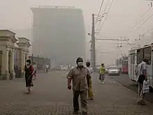 Pollution is the introduction of contaminants into the natural environment that cause adverse change.[1] Pollution can take the form of any substance (solid, liquid, or gas) or energy (such as radioactivity, heat, sound, or light). Pollutants, the components of pollution, can be either foreign substances/energies or naturally occurring contaminants. Although environmental pollution can be caused by natural events, the word pollution generally implies that the contaminants have an anthropogenic source – that is, a source created by human activities. Pollution is often classed as point source or nonpoint source pollution. In 2015, pollution killed nine million people worldwide (one in six deaths).[2][3] This remained unchanged in 2019, with little real progress against pollution being identifiable. Air pollution accounted for 34 of these earlier deaths.[4][5]