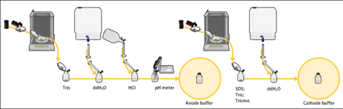 - ↑ Schägger H, von Jagow G (1987). "Tricine-sodium dodecyl sulfate-polyacrylamide gel electrophoresis for the separation of proteins in the range from 1 to 100 kDa". Anal. Biochem. 166 (2): 368–379. doi:10.1016/0003-2697(87)90587-2. PMID 2449095.