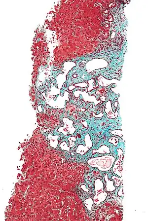 | Micrograph showing a von Meyenburg complex, a bile duct hamartoma associated with polycystic liver disease. Trichrome stain. | |