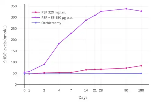 PEP has been studied for the treatment of prostate cancer at dosages of 160 mg/month (three studies) and 240 mg/month (four studies).[24] At a dosage of 160 mg/month, PEP incompletely suppresses testosterone levels, failing to reach the castrate range, and is significantly inferior to orchiectomy in slowing disease progression.[24][2] Conversely, PEP at a dosage of 240 mg/month results in greater testosterone suppression, into the castrate range similarly to orchiectomy, and is equivalent to orchiectomy in effectiveness.[24][2]