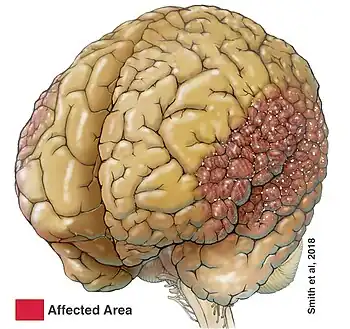 - ↑ 4.0 4.1 4.2 4.3 4.4 4.5 4.6 4.7 Stutterd CA, Leventer RJ (June 2014). "Polymicrogyria: a common and heterogeneous malformation of cortical development". Am J Med Genet C Semin Med Genet. 166C (2): 227–39. doi:10.1002/ajmg.c.31399. PMID 24888723. S2CID 24534275.