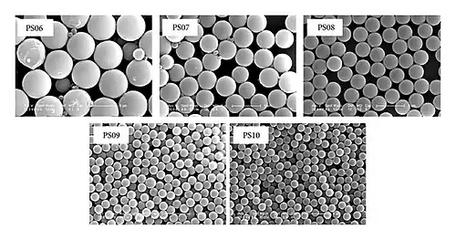 The way that microspheres are prepared can influence their physical properties. Preparation methods such as precipitation polymerization, seed polymerization, microemulsion, and dispersion polymerization have been used in the past to create polystyrene microspheres.[16] Precipitation polymerization is a robust method of polymer synthesis where a monomer and initiator are dissolved in a solvent.[16] This method is advantageous due to low viscosities, clean surfaces, low solid content, and irregular geometries, factors which are beneficial in physiological environments.[16] Seed polymerization is a preparation method used to create core-shell emulsions.[16] These structures have good stability and narrow particle size distribution, however, due to a long and complex preparation process there is a high likelihood of monomers becoming embedded inside the particles.[16] Microemulsions are a method of creating emulsions through an emulsifier.[16] By creating particles with microbubbles, this method can create particles that have similar particle size and stability.[16] Dispersion polymerization is a method of creating particles with similar size with the advantage of being easy to perform and operate.[16] With this method, particle size can easily be modified by manipulating the concentrations of stabilizer, co-monomer, and water.[16][17] Due to these reasons, dispersion polymerization has become one of the primary methods of polystyrene microsphere synthesis.[16] Each of these methods offer their own advantages and disadvantages and are chosen for microsphere synthesis accordingly.