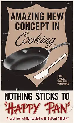 In 1954, Colette Grégoire urged her husband, the French engineer Marc Grégoire, to try the material he had been using on fishing tackle on her cooking pans. He subsequently created the first PTFE-coated non-stick pans under the brand name Tefal (combining "Tef" from "Teflon" and "al" from aluminium).[16] In the United States, Marion A. Trozzolo, who had been using the substance on scientific utensils, marketed the first US-made PTFE-coated pan, "The Happy Pan", in 1961.[17] Non-stick cookware has since become a common household product, now offered by hundreds of manufacturers across the world.