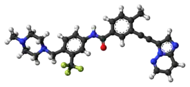 Ponatinib, sold under the brand name Iclusig, is a medication used to treat chronic myeloid leukemia (CML) and acute lymphoblastic leukemia (ALL) which is Philadelphia chromosome–positive (Ph+).[1] It is used when other treatments have failed.[1] It is taken by mouth.[1]
