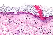 Porokeratosis is a specific disorder of keratinization that is characterized histologically by the presence of a cornoid lamella, a thin column of closely stacked, parakeratotic cells extending through the stratum corneum with a thin or absent granular layer.[1]: 532