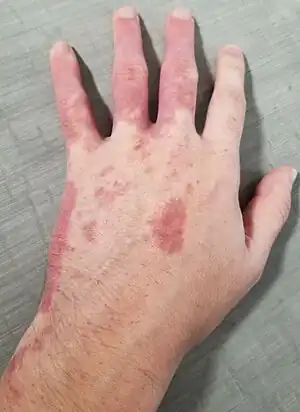 | Symptoms | Dark red or purple area of skin with defined borders[1] |