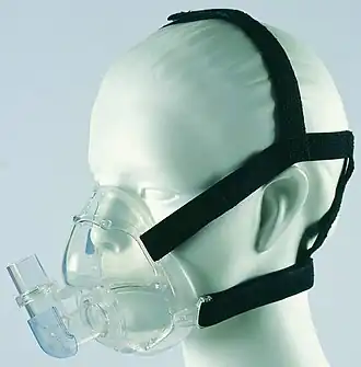 The mask required to deliver CPAP must have an effective seal, and be held on very securely. The "nasal pillow" mask maintains its seal by being inserted slightly into the nostrils and being held in place by various straps around the head. Some full-face masks "float" on the face like a hover-craft, with thin, soft, flexible "curtains" ensuring less skin abrasion, and the possibility of coughing and yawning. Some people may find wearing a CPAP mask uncomfortable or constricting: eyeglass wearers and bearded men may prefer the nasal-pillow type of mask. Breathing out against the positive pressure resistance (the expiratory positive airway pressure component, or EPAP) may also feel unpleasant to some patients. These factors lead to inability to continue treatment due to patient intolerance in about 20% of cases where it is initiated.[5] Some machines have pressure relief technologies that makes sleep therapy more comfortable by reducing pressure at the beginning of exhalation and returning to therapeutic pressure just before inhalation. The level of pressure relief is varied based on the patient's expiratory flow, making breathing out against the pressure less difficult.[6] Those who have an anxiety disorder or claustrophobia[7] are less likely to tolerate PAP treatment. Sometimes medication will be given to assist with the anxiety caused by PAP ventilation.