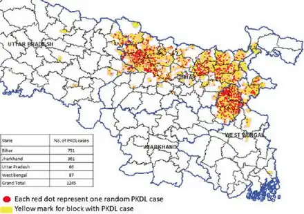 - ↑ Zijlstra, EE; Alves, F; Rijal, S; Arana, B; Alvar, J (November 2017). "Post-kala-azar dermal leishmaniasis in the Indian subcontinent: A threat to the South-East Asia Region Kala-azar Elimination Programme". PLOS Neglected Tropical Diseases. 11 (11): e0005877. doi:10.1371/journal.pntd.0005877. PMC 5689828. PMID 29145397.