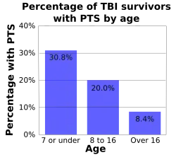 Age influences the risk for PTS. As age increases, risk of early and late seizures decreases; one study found that early PTS occurred in 30.8% of children age 7 or under, 20% of children between ages 8 and 16, and 8.4% of people who were over 16 at the time they were injured (graph at right).[5][22] Early seizures occur up to twice as frequently in brain injured children as they do in their adult counterparts.[5] In one study, children under five with trivial brain injuries (those with no LOC, no PTA, no depressed skull fracture, and no hemorrhage) had an early seizure 17% of the time, while people over age 5 did so only 2% of the time.[5] Children under age five also have seizures within one hour of injury more often than adults do.[11] One study found the incidence of early seizures to be highest among infants younger than one year and particularly high among those who sustained perinatal injury.[14] However, adults are at higher risk than children are for late seizures.[24] People over age 65 are also at greater risk for developing PTS after an injury, with a PTS risk that is 2.5 times higher than that of their younger counterparts.[25]