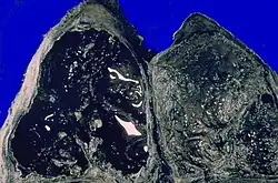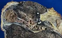 PTLD affects a substantial proportion of TB survivors[3] (of whom there were an estimated 155 million globally in 2020), estimated as much as 50 percent overall and more than 70 percent in survivors of multi-drug-resistant tuberculosis.[4] Around 10 percent have lost more than half of their lung function.[4] Delayed diagnosis of TB, multidrug-resistant tuberculosis, and repeated TB infections are correlated with greater incidence of PTLD.[2] People who have HIV are less likely to have PTLD, possibly because of their impaired immune response.[2][3] Cigarette smokers are 25% more likely to have lung damage, and more severe damage, after cure of a TB infection.[5] People who cook with 3-4 stoves instead of 1-2 stoves are more likely to have lung damage. A lack of heating also increased how often symptoms occurred. Alcoholism also increased the risk of PTLD. Ambient air pollution did not increase the risk of PTLD. These kinds of pollution include methods of household lighting; modes of household ventilation; secondary cigarette smoking; urban, rural or traffic exposures. Food insecurity, eating cereals, and consuming oily food were strongly associated with symptomatic PTLD. Eating fruits and drinking juice at least once a week were associated with reduced odds of developing symptomatic PTLD.[6] Co-infection may make lung damage worse, and thus vaccination is recommended to prevent PTLD.[1][2] Many studies have found a link between TB and later diagnosis with chronic obstructive pulmonary disease.[7]