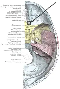 Base of the skull. Upper surface. (On the left, "Posterior ethmoidal foramen" is the 9thlabel from the right. | |