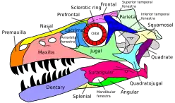 The postorbital is one of the bones in vertebrate skulls which forms a portion of the dermal skull roof and, sometimes, a ring about the orbit. Generally, it is located behind the postfrontal and posteriorly to the orbital fenestra. In some vertebrates, the postorbital is fused with the postfrontal to create a postorbitofrontal. Birds have a separate postorbital as an embryo, but the bone fuses with the frontal before it hatches.