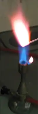Potassium is the second least dense metal after lithium. It is a soft solid with a low melting point, and can be easily cut with a knife. Potassium is silvery in appearance, but it begins to tarnish toward gray immediately on exposure to air.[21] In a flame test, potassium and its compounds emit a lilac color with a peak emission wavelength of 766.5 nanometers.[22]