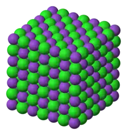 Under ambient conditions, the crystal structure of potassium chloride is like that of NaCl. It adopts a face-centered cubic structure known as the B1 phase with a lattice constant of roughly 6.3 Å. Crystals cleave easily in three directions. Other polymorphic and hydrated phases are adopted at high pressures.[41]