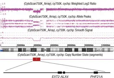 | Red bar indicates an 8.6 Mb deletion at 11p11.2p12 including EXT2, ALX4, and PHF21A. | |