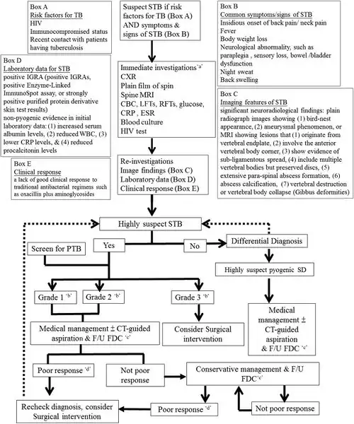 - ↑ 1.00 1.01 1.02 1.03 1.04 1.05 1.06 1.07 1.08 1.09 1.10 Rasouli MR, Mirkoohi M, Vaccaro AR, Yarandi KK, Rahimi-Movaghar V (December 2012). "Spinal tuberculosis: diagnosis and management". Asian Spine Journal. 6 (4): 294–308. doi:10.4184/asj.2012.6.4.294. PMC 3530707. PMID 23275816.