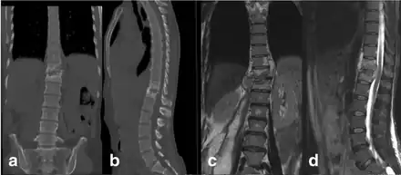 - ↑ 8.0 8.1 8.2 8.3 Ansari, Sajid; Amanullah, Md. Farid; Rauniyar, RajKumar; Ahmad, Kaleem (2013). "Pott′s spine: Diagnostic imaging modalities and technology advancements". North American Journal of Medical Sciences. 5 (7): 404–411. doi:10.4103/1947-2714.115775. PMC 3759066. PMID 24020048.