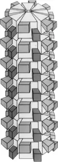 CI (~71 kDa) is an RNA helicase with ATPase activity.[15] Its most unusual property is its ability to form large and highly symmetrical conical and cylindrical inclusions with a central hollow cylinder from which laminate sheets radiate outward and fold in on themselves in a pattern often described as "pinwheels". These inclusions are easily seen in transmission electron micrographs of infected tissues and were historically used as a diagnostic criterion for potyvirus infections. CI inclusions are a major component of the potyviral movement complex which is assembled at plasmodesmata. CI is also required for viral replication and is present on replication membranes. Its exact contributions to replication are not clear but, as an RNA helicase, CI is likely facilitating replication by dismantling the secondary structures of viral RNA.