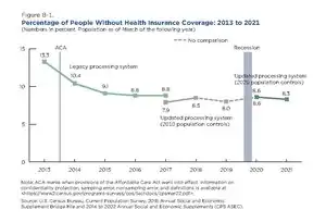 - ↑ Martinez, Michael E.; Clarke, Tainya C. (2020). "Percentage of Families That Did Not Get Needed Medical Care Because of Cost, by Poverty Status--National Health Interview Survey, United States, 2013 and 2018". Morbidity and Mortality Weekly Report. 69 (23): 727. doi:10.15585/mmwr.mm6923a4. PMC 7315793. PMID 32525851.