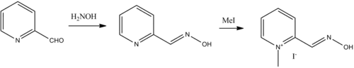 Pralidoxime, 2-pyridinaldoxime methylchloride, is prepared by treating pyridine-2-carboxaldehyde with hydroxylamine. The resulting pyridine-2-aldoxime is alkylated with methyl iodide giving pralidoxime as the iodide salt.[7][8][9][10]